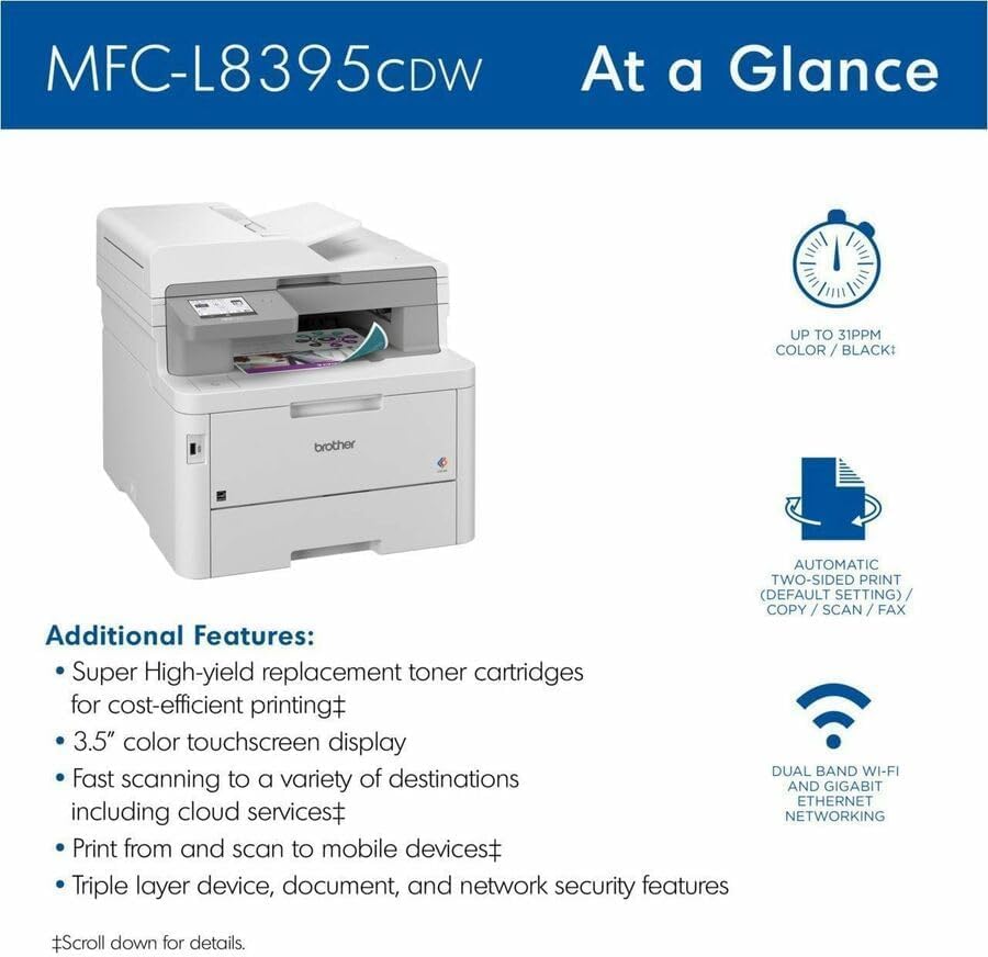 The Brother Workhorse MFC-L8395CDW digital color all-in-one printer is a great choice for small businesses, busy offices, and small workgroups that need cost-efficient, high-quality color output, versatile paper handling, and advanced scanning and security features. This compact all-in-one printer helps to increase productivity with fast print and copy speeds up to 31 ppm. Delivers cost-efficient printing by using the Brother Genuine TN229XXL super high-yield replacement toner cartridges. Triple Layer Security features help to limit document and device access and protect against network intrusions. Offers versatile paper handling with a 250-sheet capacity paper tray that is expandable with an optional tray. Quickly scan multi-page, two-sided documents to a wide variety of destinations using the 50-page capacity auto document feeder. The 3.5 touchscreen display allows for the creation of customized shortcuts to frequently used workflows. The MFC-L8395CDW also provides flexible connectivity with built-in Gigabit Ethernet and dual band wireless networking or connect to a single computer via USB interface. Print vivid color and sharp black documents from virtually anywhere with mobile device printing and scanning. Machine Functions: Copy; Fax; Print; Scan; Printing Type: Laser; Maximum Print Speed (Black): 31 ppm; Maximum Print Speed (Color): 31 ppm.Fast color printing and copying for increased efficiency. Cost-efficient output. Fast, duplex scanning. Advanced scanning capabilities. Versatile paper handling. Flexible connectivity. Starter Toner Cartridges; Drum Unit; Belt Unit; Waste Toner Box; AC Power Cord; Telephone Line; Product Safety Guide; Reference Guide; Warranty Card; Quick Setup GuideGlobal Product Type:Printer, Copier, Scanner, Fax Multifunction Machines Global Product Type:Printer, Copier, Scanner, Fax Multifunction Machines Machine Functions:Copy Machine Functions:Copy Machine Functions:Fax <...